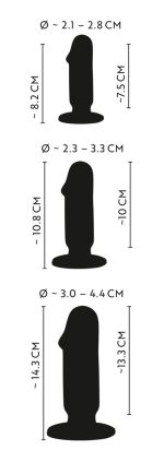 Butt Plug Training Kit from ANOS that includes 3 butt plugs with different sizes and weights for pleasurable stimulation or stretching and training of the anus. Each flexible plug has a realistically shaped glans and a large suction cup which means that it can be worn safely (over long periods of time) without slipping in too far. The plugs are also perfect for hands-free fun.