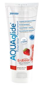 Vegan, water-based lube AQUAglide Strawberry from Joydivision with a natural strawberry scent and flavour and optimal long-term gliding properties. Sugar-free, food-grade quality – also suitable for oral pleasure. Highly effective and economical. Non-greasy and free of oil. Dermatologically tested and pH-optimised for intimate balance. Safe for use with latex condoms. Quality Made in Germany. 100 ml.