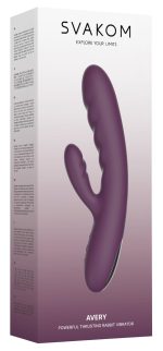 The rabbit vibrator Avery from SVAKOM has an energetic thrust function for deep and intense dual vagina and clitoris stimulation. The flexible silicone vibrator is velvety soft and this means that it is very easy to hold and it also slides over the skin and into intimate depths almost on its own as well.