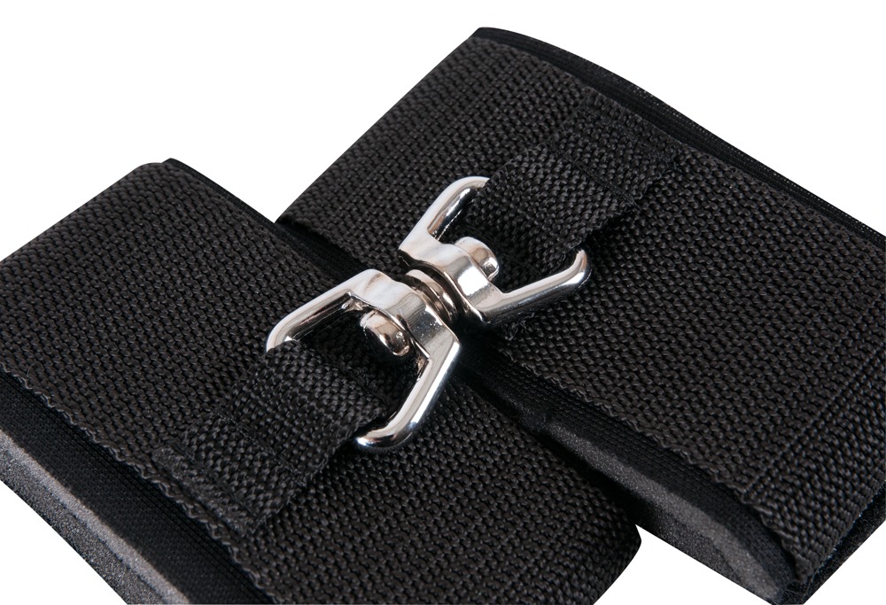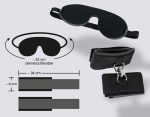 Two padded handcuffs with a hook and loop fastener that are connected by a swivel-ring. Including an opaque padded blindfold with an elastic strap. Perfect for beginners! Restraints when opened 34 cm long, 6 cm wide. 60% PP, 33% PE, 5% PU, 2% metal. All metal parts are chrome-plated.
