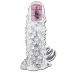 Increase your size and performance for intense bedroom fun with this vibrating penis sleeve. This sleeve is designed to fit around your erection, giving your erection more length and girth to play with, plush textures, an extra inch of length, and a vibrating motor right at the tip.