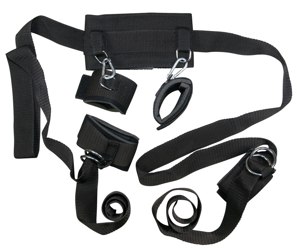 Two 155 cm long straps are firmly attached to the 10 cm wide collar, to which the two ankle cuffs are attached with eyelets. The handcuffs are hooked on with snap hooks. All cuffs are padded and adjustable with hook-and-loop fasteners. Black.