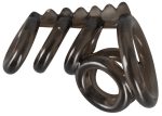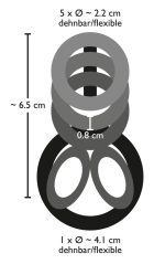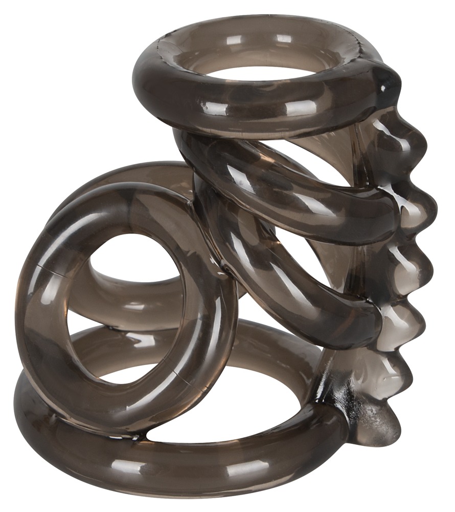 Smoke-coloured ring for penis and testicles with 6 rings in total all connected by a nubby strap. One ring for the scrotum, the next two rings for the testicles and three rings for the penis. Length strap approx. 7 cm, Ø rings 2.2-4.1 cm, flexible. Material: TPE.
