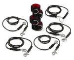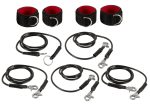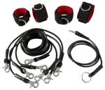 The 9-piece black Bondage Set from You2Toys has 4 restraints, 4 leashes with snap hooks and 1 connection strap. The soft restraints are suitable for hands and/or feet. They can be put on quickly and adjusted to fit, thanks to their hook and loop fasteners. Each restraint has an attachment ring for the leashes. The sturdy leashes have soft surfaces and snap hooks at either end. The connection strap also has a ring at either end.