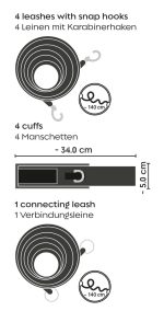 The leashes, with the restraints that can be attached quickly, are suitable for tying someone up, attaching someone to something e.g. furniture, and restricting someone’s movement. They can be combined with each other via the connection strap. The restraint set is also perfect for pillory games and bedroom fun with arms and legs spread wide apart.
