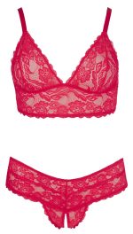 Delicate red lace: wireless bra without fasteners and with adjustable straps. Fancy, crotchless briefs for passionate hours with your partner.