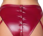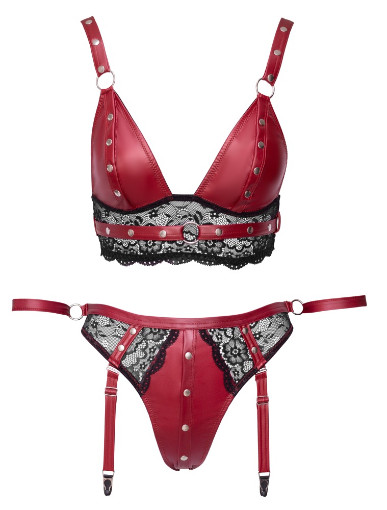 Bralette and suspender briefs from Cottelli BONDAGE made out of beautiful red matte look material with delicate black lace inserts and silver-coloured metal elements. The seductive bralette has slitted cups that can be opened quickly because they have press studs. The bralette straps and the strap underneath the breasts can be adjusted for a perfect fit. The suspender briefs also have press studs and can be opened from the top of the crotch to the top of the buttocks. There are rings at the sides and at the back. The two included restraints (with hook and loop fasteners) can be pulled through the rings. The suspender straps are adjustable and can be removed completely.