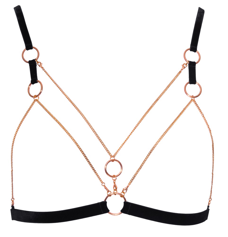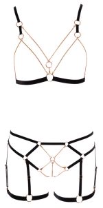 Wireless, open cup bra and crotchless briefs from Cottelli LINGERIE made out of stretchy velvet straps and rose-gold colored chains with rings. The briefs have stretchy lace over the buttocks. There is a hook fastener at the back of the bra and the bra straps can be adjusted for a perfect fit. There are chains with snap hooks on the bra – some of the chains can be removed. There are also chains with snap hooks on the briefs and they can be removed. The adjustable thigh straps can also be removed from the briefs.