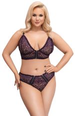 The bralette and briefs in a set from Cottelli CURVES are made entirely out of delicate, purple lace. They are soft and stretchy which means that they are very comfortable to wear. There is a full-length hook fastener between the cups. The bra straps are adjustable. The briefs have 2 hook fasteners at the front which can be used to open them completely.