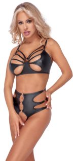 A bra and crotchless panties in a set from Cottelli LINGERIE made of black soft stretch material. A bold style with elastic straps and rose-gold rings. Soft bra with hook fastening at the back and matching adjustable straps. The waist-high cut panties seduce with 2 stretch bands around the completely open crotch.