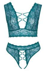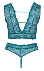 Bralette and crotchless string from Cottelli CURVES in a set. They are completely made out of soft, delicate, teal lace. The bralette is very low cut at the front and at the back – the decorative rose-gold coloured rings and stretchy straps hold it all together. The crotchless high-waist string has a seductive open front that is only held together by rings and stretchy straps.