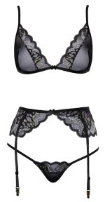 Wireless bra, suspender belt & string in a set from kissable made out of eye-catching, beautiful lace and powernet. All pieces are soft and stretchy for a very comfortable fit. The bra has adjustable straps and a hook fastener at the back. The suspender belt also has a hook fastener at the back and adjustable suspender straps. The fancy, small string is very seductive because it has two narrow, stretchy straps that come together in the crotch area.