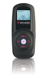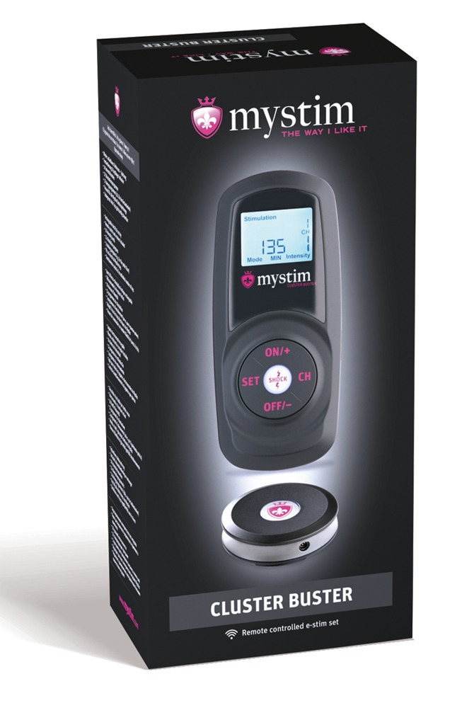 The mystim Cluster Buster comes in a beautiful storage box. A remote control, a receiver, a bi-polar electrode (self-adhesive) and an instruction manual are included in the delivery. The lithium-ion battery can be recharged with the included cable.