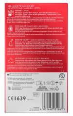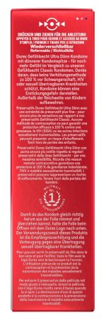 The transparent condoms, Gefühlsecht Ultra dünn from Durex, have a thin tip for very intense sensations. The condoms are in a straight shape and are teat-ended. They are covered in silicone- based lubricant.