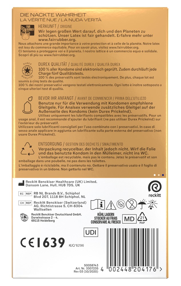 The extremely thin, transparent condoms, Hautnah Extra feucht from Durex, are great for realistic and intense sensations. They are covered in a lot of silicone-based lubricant for a very smooth feeling. Compared to conventional cylindrical condoms, the innovative anatomical Easy-on shape of the Durex condoms offers a bit more space in all the right places, making them easier to put on and roll off – ensuring a comfortable fit and an intense sensation.