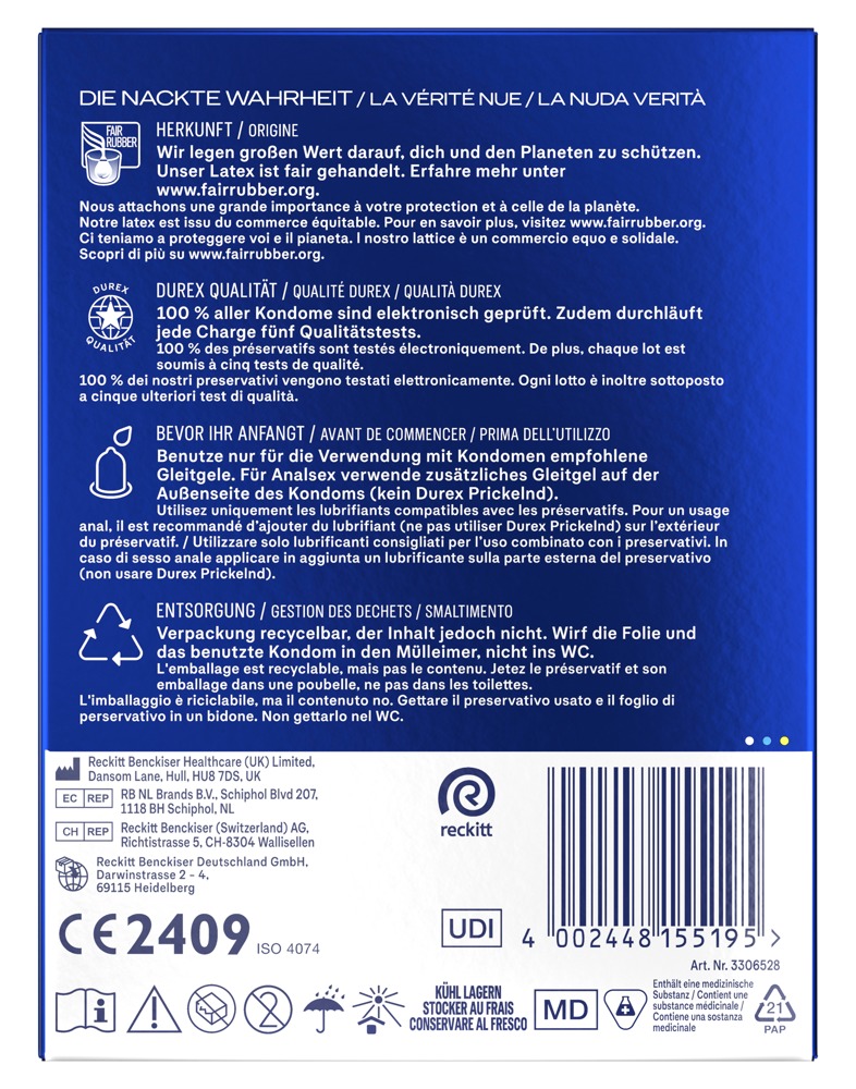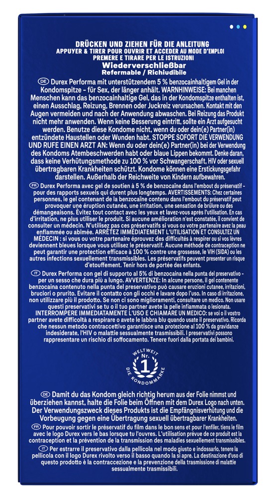 The transparent Performa condoms from Durex have gel tip that contains 5% benzocaine – this can help to delay climax and prolong the arousal phase. The condoms are covered in silicone-based lubricant. Compared to conventional cylindrical condoms, the innovative and anatomical Easy-on shape offers a little more space in all the right places – this means that they are easier to put on and roll off, as well as fitting comfortably as well.