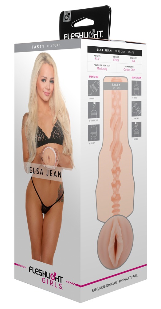 The easy-to-hold masturbator Elsa Jean Tasty from Fleshlight is in a discreet torch design and it has a realistic replica of the erotic star Elsa Jean’s vagina. The pleasure canal has various stimulating textures and different diameters which means that it feels like Elsa’s tight vagina. It is also perfect for intense, orgasmic massages during a hand job. The inner sleeve is made out of extremely soft, skin-like material. There is also Elsa’s signature next to the opening. The sleeve can also be removed from the case for cleaning.