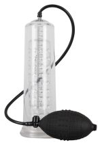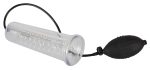 Transparent penis pump with a knobbed inner sleeve (Ø 4.5 cm flexible, length approx. 20 cm) and handy pump ball. You can see the success of how much your penis has increased by with the scale. With a safety pressure valve. Cylinder approx. 25 cm long. Material: ABS, TPE (sleeve), PVC (pump ball).