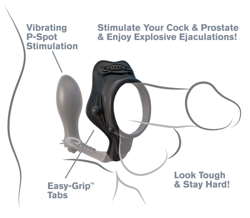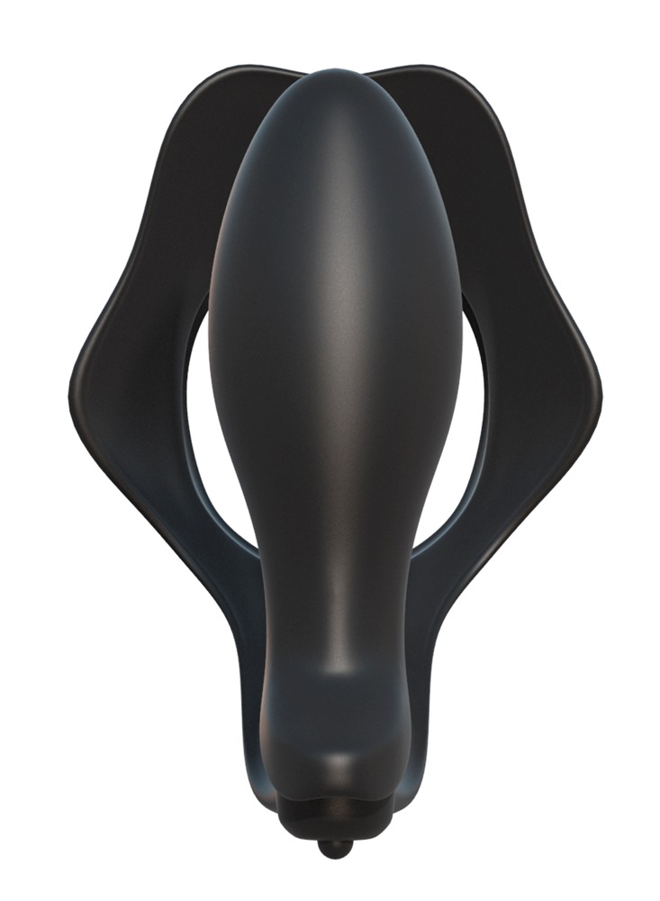 Stronger erections AND prostate stimulation at the same time – that’s exactly what this combined cock ring and plug is here for. Cock ring and plug are connected by a narrow bar. The ring just has to be slipped over the penis to increase hardness, while the vibrating plug stimulates the anal pleasure center. A combination for truly powerful, explosive orgasms! Please order batteries separately (1 x AAA).