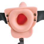 Realistic, hollow strap-on dildo with stretchy straps and 10 vibration modes. The bulging guy stands out with its realistic details and because it’s completely life-like. It can be worn by men and women. Includes a remote control and it can be recharged with the included USB cable.