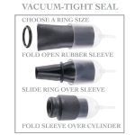 Choose a ring first, slide it over the sleeve, fold the sleeve over the inflating cylinder, and enjoy a tight seal over your glans. Each time you press the inflating ball, the sleeve's rubber grips your penis and glides up and down over it.