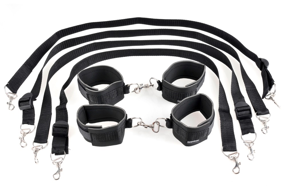 Almost any bondage fantasy is possible with this bed restraint set. The handcuffs and ankle cuffs can be fastened with the hook and loop fasteners and can be attached to each other. The included straps with snap hooks make it possible to restrain the top and the bottom of the body and tie the person to bedposts for example. The restraints are tear-proof which means that safe fun is guaranteed.