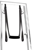 Sex swing that can be attached to a door. It does not need to be assembled. It is made up of two adjustable, black straps attached to acrylic bars with loops for the legs, a padded seat part, and loops for the wrists. Suitable for up to 136 kg. Includes a blindfold.
