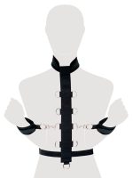 A harness made up of a waist belt and collar that are joined together with a strap that has 9 D-rings on it. The strap can be worn at the front or the back. The included restraints for the hands or the ankles can be attached to the D-rings with the snap hooks. The collar and restraints have hook and loop fasteners. The collar, restraints, strap and waist belt can be adjusted – they are therefore suitable for HIM and HER!