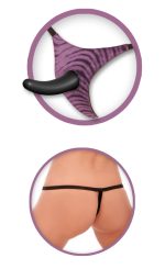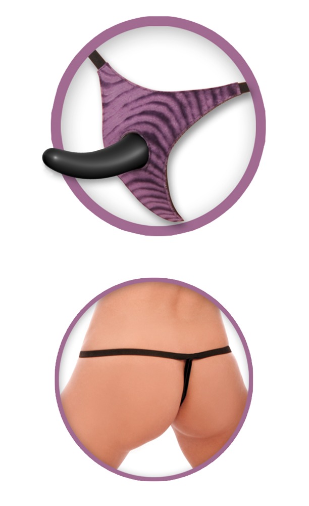 Strap-on string with a removable dildo and vibro-bullet for unlimited pegging fun – it can also fulfill lesbian thrusting fantasies. It is a wonderfully curved dildo with a suction cup. The dildo comes to a point at the end (P-spot tip) – it can also be used for solo or hands-free fun. The dildo can be quickly inserted into the hole at the front of the string. The included vibro-bullet for thrilling additional stimulation can also be placed at the front of the string. The string with stretchy straps is suitable for size S–L. The batteries for the vibro-bullet are included.