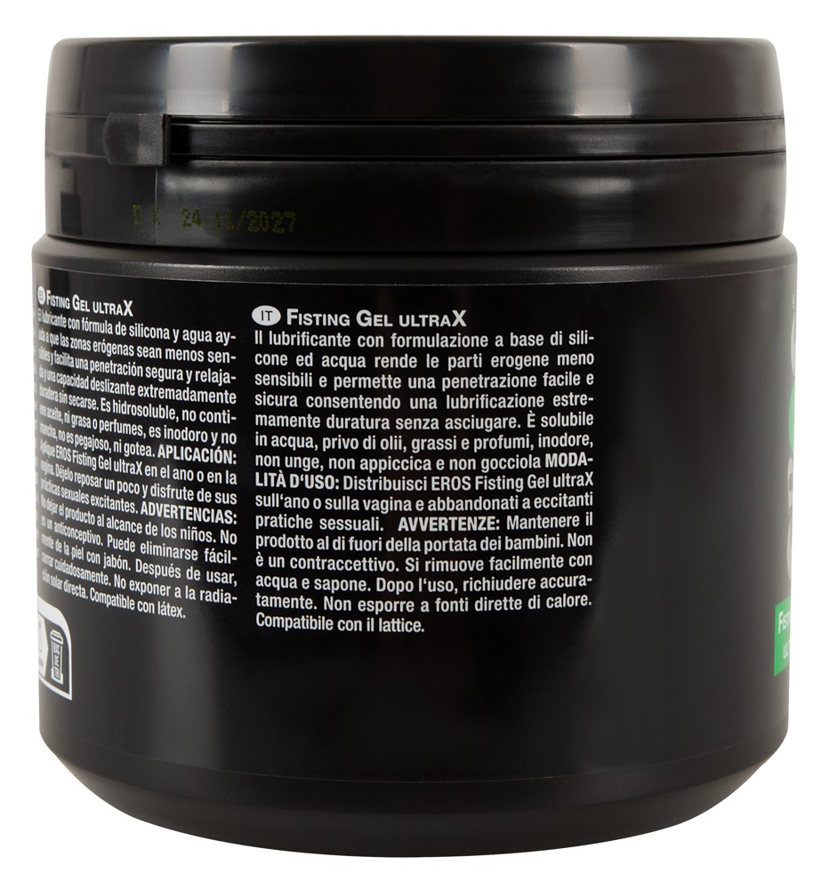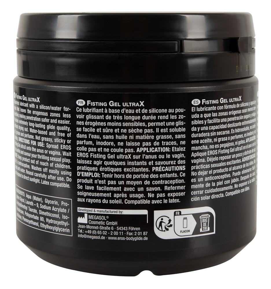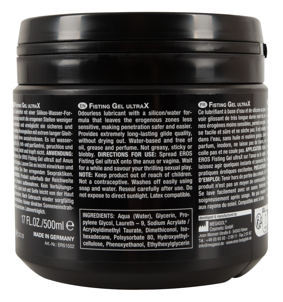 The silicone-water-based lubricant, Fisting Ultra X from EROS, has extremely long-lasting lubrication and doesn’t dry out. Water-soluble, free from oil, grease and perfume, odourless. It does not smear, stick or drip. Apply to the desired areas of the body, allow it to soak in slightly and then enjoy exciting sex. Compatible with latex.