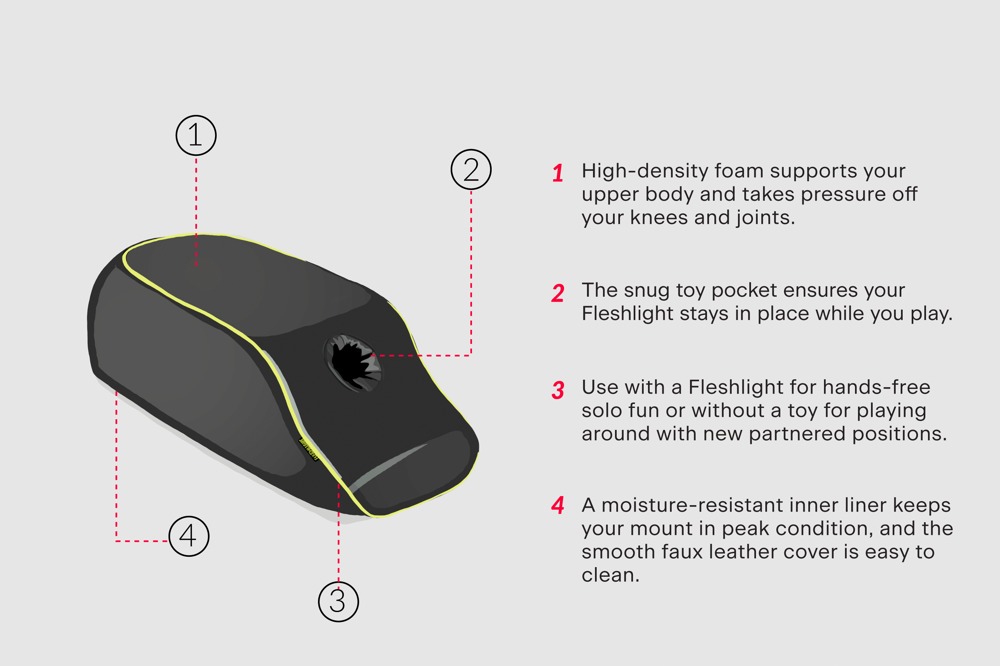 Cushion with a space for a Fleshlight masturbator (not included). The masturbator can be inserted into the hole in the cushion so that it is in the perfect position – this makes intense thrusting pleasure in the missionary position possible. It can also be used as a sex cushion when having sex with a partner – the ergonomic, angled shape makes various positions for very deep stimulation possible. The imitation leather cushion is easy to clean.