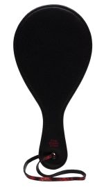 High-quality spanking paddle Sweet Anticipation Round Paddle from Fifty Shades of Grey with two differently textured sides for varied sensations: one side is in a black leather look with a coarse texture, the other side is smooth and in a black/red satin rose design. With a wrist loop.