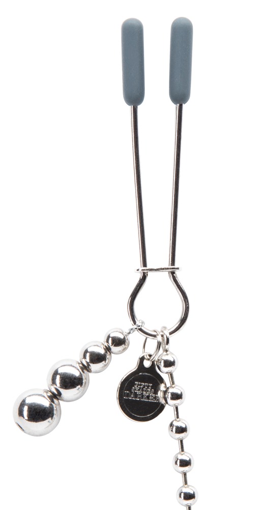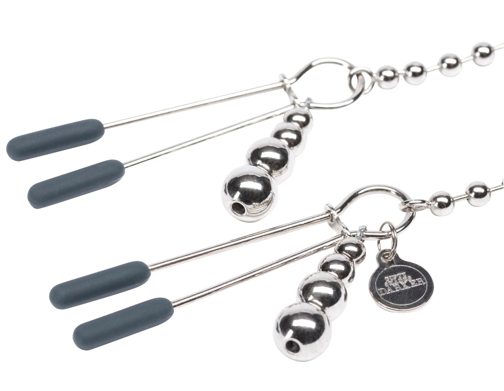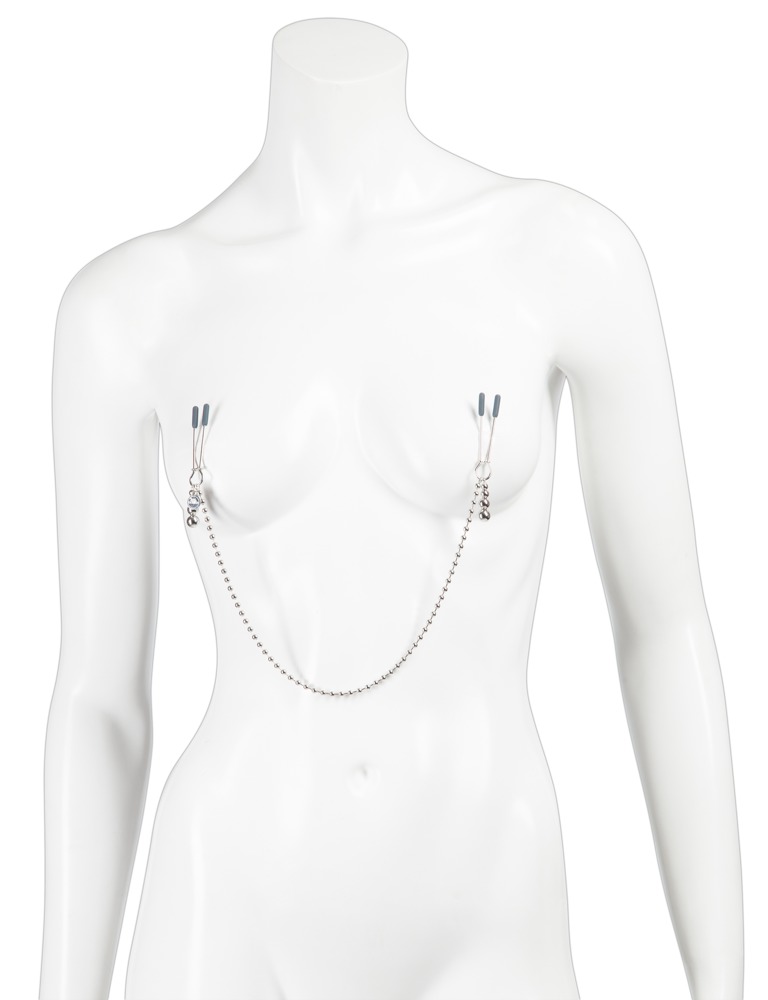 This silver-coloured boob chain with beads on both ends is the perfect accessory for your breasts and you will definitely have all eyes on you. You can easily adjust the pressure intensity with a movable ring. The ends of the clamps are covered in black silicone for even more comfort. Includes a satin storage back. Length: 37 cm.