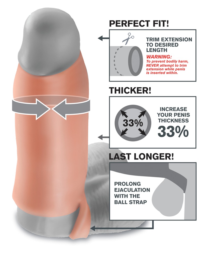 This penis sleeve is made out of soft, stretchy, skin-like material (Real Feel). The sleeve gets the penis into tip-top shape for fulfilling moments of pleasure. The tight-fitting sleeve with its integrated testicle ring should be slid over the erect penis. The testicle ring makes sure that the sleeve stays on securely and doesn’t slip off. The magnificent outer diameter makes the girth of the penis 33% thicker. The sleeve is open at the tip so that the glans are uncovered. It can also be cut to fit.