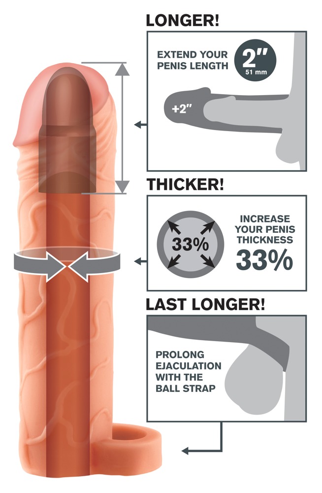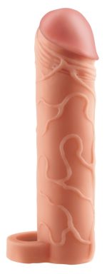 Penis sleeve with pronounced veins and firm padded glans that extend the penis by 5.1 cm. It also makes the penis 33% thicker and supports the erection at the same time. The flexible ball ring means that the sleeve fits securely and makes the penis feel like it is held nice and tightly.
