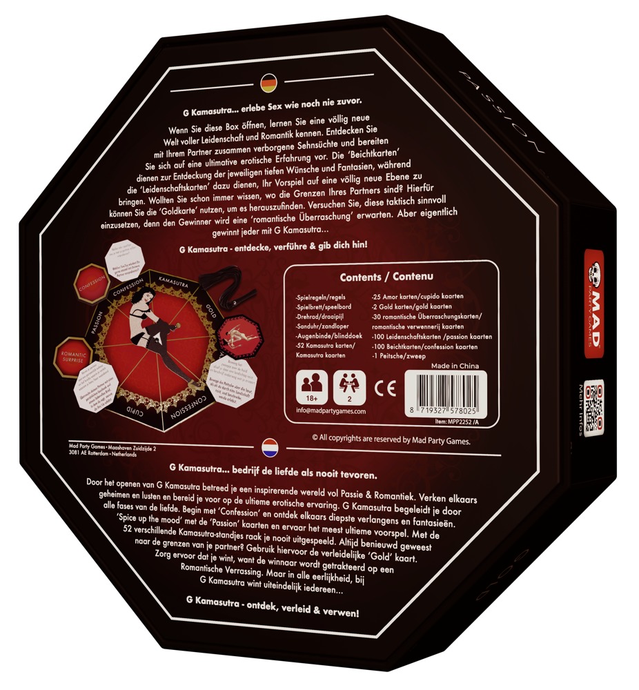 Board game for couples. German/Dutch version. Contents: 1 game board with a rotating figure, 302 cards (2 Gold, 25 Romantic, 25 Cupid, 50 Kama Sutra, 100 Confession, 100 Passion), 1 satin blindfold, 1 flogger, 1 hourglass.