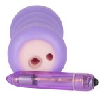 Purple masturbator with a tight opening that has grooves inside and is open at both ends. The included mini vibrator with 5 vibration modes at the push of a button can be placed in the specific opening. Complete length approx. 14 cm long. Material: TPR, ABS. (Please order battery separately: 1 x AAA).