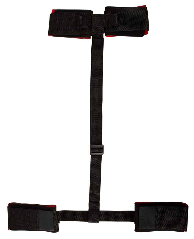 Handcuffs and ankle cuffs on a connection strap (length can be adjusted up to 80 cm). Made out of tearproof synthetic fibre (100% polyamide). Restraints are softly padded and can be adjusted with the hook and loop fasteners. For HIM and HER.
