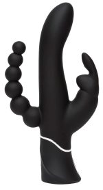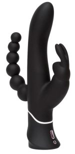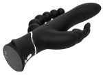 Do you love vaginal and anal stimulation? Do you prefer simultaneous stimulation? And your pearl of pleasure should get overlooked either? Then this double vibrator is perfect for you because it can do all that! This vibrator has a slightly curved shaft, a rabbit-shaped clit tickler with flexible ears and anal beads. The vibrator has three motors (one in the shaft, one in the clit tickler and one in the anal beads) There are 12 vibration modes in the shaft that can be controlled at the push of a button. There are 9 vibration modes in the clit tickler and the anal beads – the tickler and beads have to be used together. The double vibrator also has a travel lock that prevents it from turning on when it’s not meant to. It can be recharged with the included USB cable. Black. Complete length 24.2 cm, Ø 3.3–3.7 cm; anal beads 11.5 cm long, Ø max. 3.8 cm. Silicone with a PU coating.