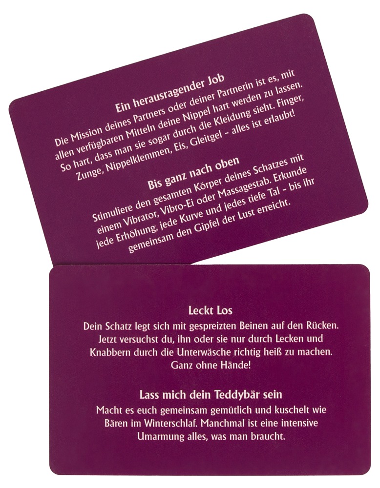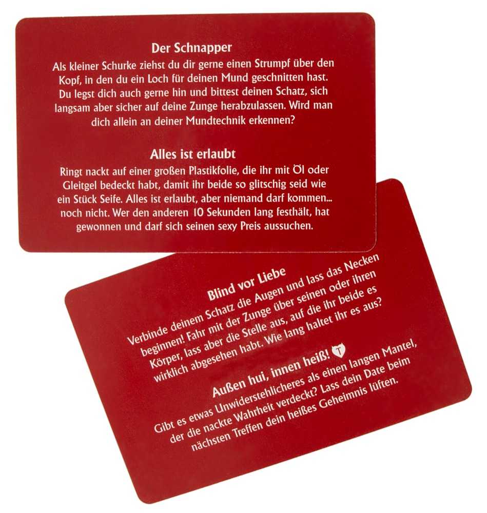 Content: game board, 4 card sets (Affection, Passion, Desire and Fantasy), 2 playing pieces, 1 dice, 3 x 4 rings for the playing pieces. Includes instructions. German version.