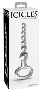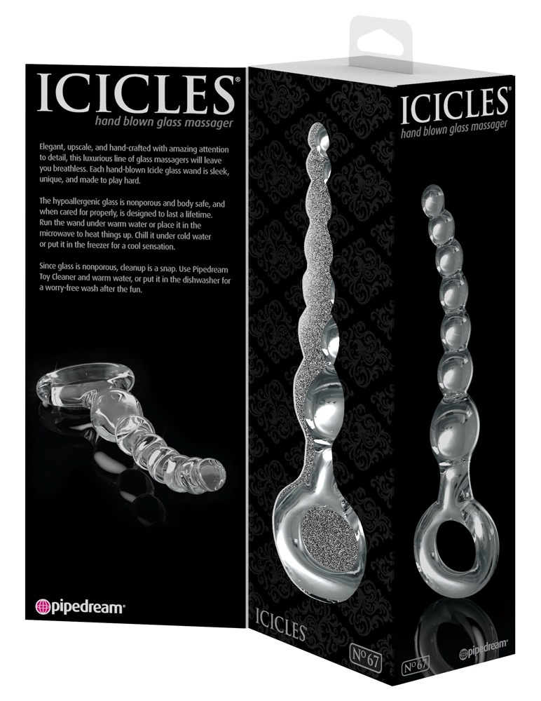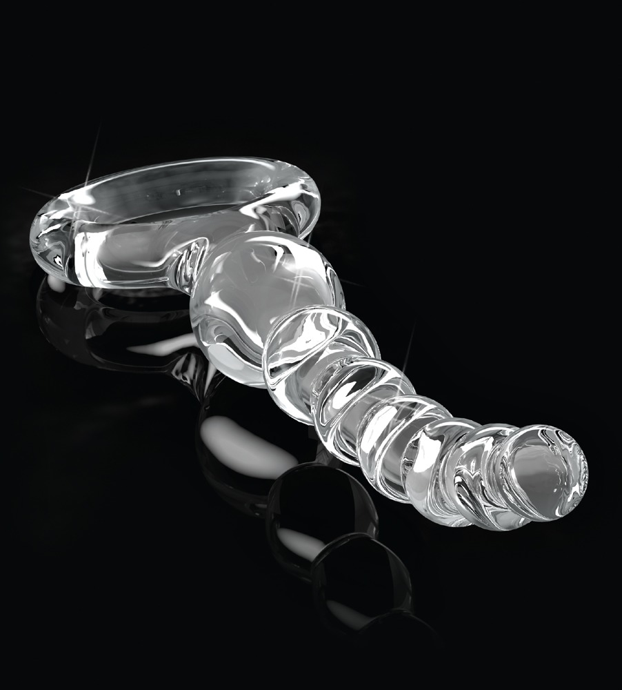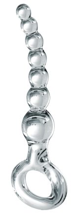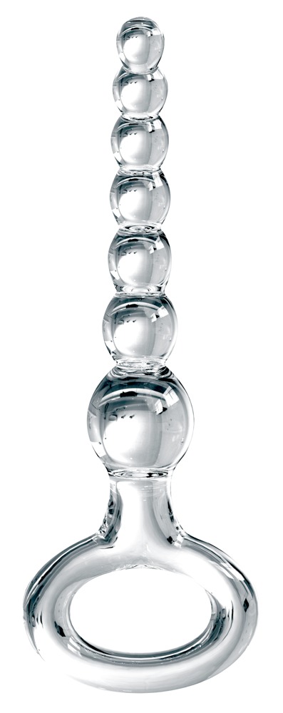 Curved anal beads made out of hand-blown glass with 7 beads and a handy retraction ring. Odourless, anti-allergenic and very hygienic because it’s really easy to clean – it can even be put in the dishwasher. Tip: warming it up in the bath or cooling it down in the fridge can increase pleasure. If it is looked after properly, this product can kept and used forever.