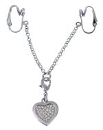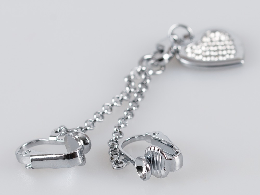 This silver-coloured chain with labia clips is an erotic eye-catcher for your partner… The heart-shaped pendant (1.5 cm) with decorative rhinestones emphasises YOUR intimate area even more. Complete length 12.7 cm (including clips, chain and pendant). Material: chrome-plated metal, acrylic.