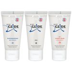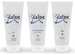 3 Just Glide lubricants in one economy pack. The water-based lubricant is 100% vegan and is also suitable for sensitive skin. Non-greasy and free from oil. Washable. Safe to use with latex condoms.