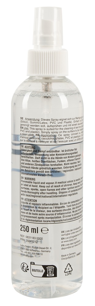 The cleaning spray Toys from Just Glide is perfect for silicone, rubber/latex, PVC and plastic toys. Just spray it on and clean it off again with a clean cloth. Very thick – a few sprays is enough for a great clean. 250 ml.