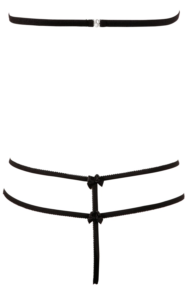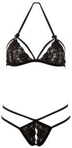 This sensual set fulfill every desire: a delicate, wireless, halterneck bra made out of floral lace. With strap details and cups that can be folded down. The matching crotchless string has additional decorative straps that look breathtakingly sexy.