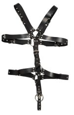 Harness made out of black, studded, leather straps and steel connection rings. It can be adjusted thanks to the buckle fasteners. The cock/ball ring (Ø 5 cm) keeps IT under control. High-quality, durable quality.