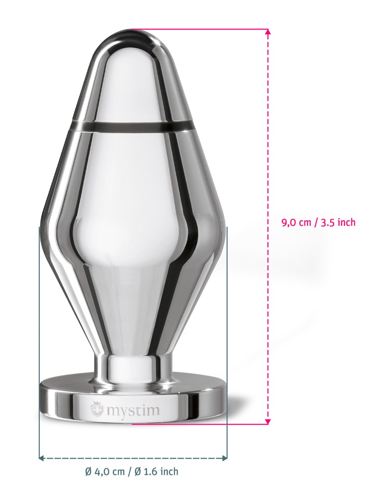The Little John Butt Plug from Mystim is for the Tension Lover or Pure Vibes stimulation device from Mystim. The e-stim plug is a great anal toy because of its 5 cm diameter. The smooth metal tapers so that the butt plug can be inserted easily. The two poles are inside after just a few centimetres and the e-stimulation can therefore be felt very early on. Tingling pleasure can be enjoyed for hours or the stimulation can be varied and intensified so that sensational climaxes can be achieved. The metal plug can be warmed up on the radiator or cooled down in the fridge before use.
