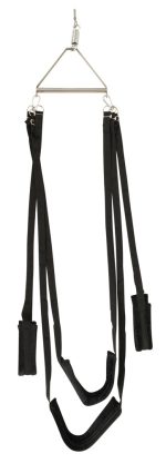 Black sex swing made up of two adjustable loops for the body and two short loops for the legs. The loops are on a sturdy metal suspension bar with a spring. All loops have soft padding. Max. length of the swing 180 cm. Max. weight 180 kg. Material 35% polyurethane, 25% polyester, 40% polyamide, metal. Includes mounting accessories.