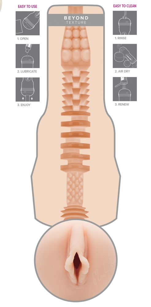 The Madison Ivy Beyond is equipped with a realistic replica of Madison Ivy’s vagina. The sleeve is surrounded by a high-quality, pearl white case. Small highlights are the artificial labia and Madison Ivy’s signature. Aside from its star qualities, the Madison Ivy Beyond also excels through its exceptionally realistic feel – the masturbator’s sleeve is made out of the skin-like material Superskin. Inside the masturbator is a special texture with dots that provides intense stimulation. Complete length / penetration depth 25 cm, Ø flexible. TPE, ABS.