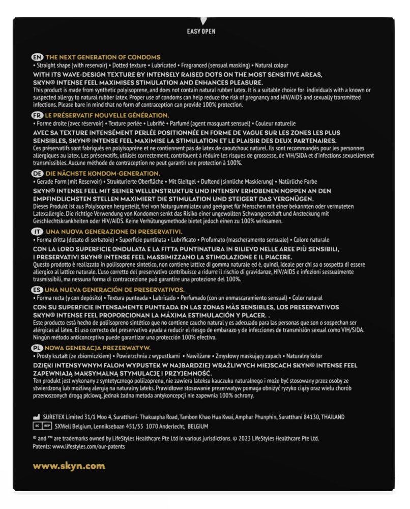 Ultra-thin transparency for even more feeling: ribbed, silicone-based condoms Manix SKYN Intense Feel with a lubrication coating. Vegan. The polyisoprene material of the condoms is called Skynfeel and is softer and more elastic than latex, but just as resilient and without the characteristic latex smell. It is therefore ideal for people who are suffering from latex allergies.